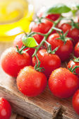 pomidory wiśniowe bazylia i oliwa z oliwek na drewnianym tle