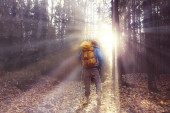 kobieta sport styl jesień las, fitness turystyka w żółtym parku liść opadają słońce