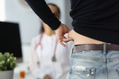 Młoda kobieta z nagim brzuchem stojąca przed lekarzem w klinice zbliżenie