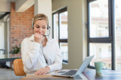ładna kobieta wyglądająca na zaskoczoną, otwartą, zszokowaną, zdającą sobie sprawę z nowej myśli, pomysłu lub koncepcji