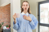 ładna kobieta czuje się szczęśliwa, zaskoczona i radosna, uśmiecha się z pozytywnym nastawieniem, realizując rozwiązanie lub pomysł
