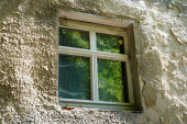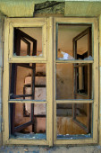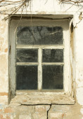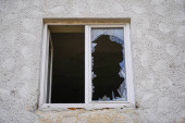 Stara drewniana rama i stłuczone szklane okno na starym budynku do renowacji
