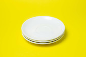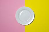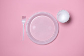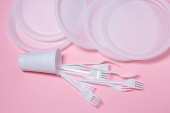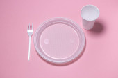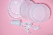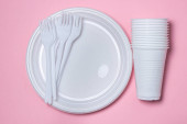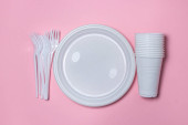 Plastikowe naczynia na różowym tle. Jednorazowa zastawa stołowa. Wyroby z tworzyw sztucznych.