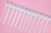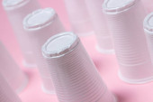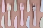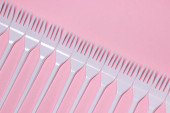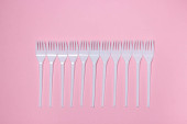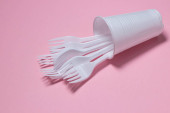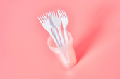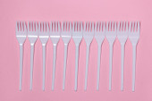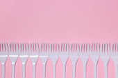 Plastikowe widelce na różowym tle. Jednorazowa zastawa stołowa. Wyroby z tworzyw sztucznych.