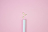 Plastikowe okulary na różowym tle. Jednorazowa zastawa stołowa. Wyroby z tworzyw sztucznych.