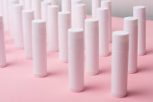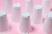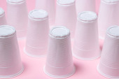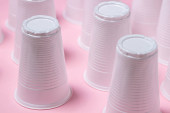 Plastikowe okulary na różowym tle. Jednorazowa zastawa stołowa. Wyroby z tworzyw sztucznych.