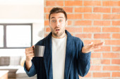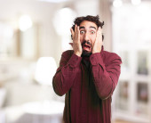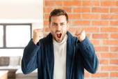 przystojny mężczyzna krzyczy z rękami w górze, czując się wściekły, sfrustrowany, zestresowany i zdenerwowany