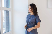 ładna kobieta na widoku profilu szuka kopiować przestrzeń przed, myślenie, wyobrażanie sobie lub marzenia na jawie