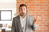 przystojny biznesmen czuje się szczęśliwy, podekscytowany, zaskoczony lub zszokowany, uśmiechnięty i zdumiony czymś niewiarygodnym