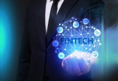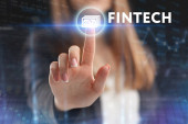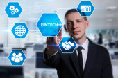Biznes, Technologia, Internet i koncepcja sieci. Młody przedsiębiorca pracuje na wirtualnym ekranie przyszłości i widzi napis: Fintech