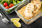 Filet z piersi kurczaka i sałatka warzywna z pomidorami i zielonymi liśćmi na jasnym tle. Koncepcja zdrowej żywności i diety keto
