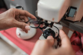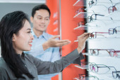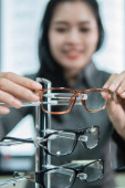 selektywne skupienie się na pięknym sprzedawcy dającym klientom okulary