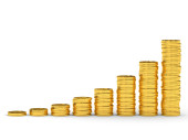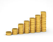 Postęp finansowy: złote i srebrne monety stosy nad białym