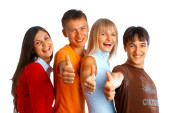 szczęśliwy grupa przyjaciół dorywczo gospodarstwa Dodaj baner na białym tle
