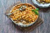 Placek rybny z halibutem, okoniem morskim i krewetkami królewskimi