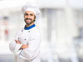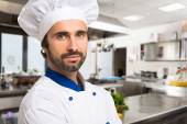 Wesoły kucharz trzymający drewnianą łyżkę w kuchni