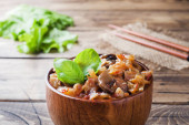 Gotowana bulwa ze świeżą cytryną i miętą na talerzu. Tradycyjne orientalne danie o nazwie Tabouleh drewniane tło rustykalny widok z góry, przestrzeń kopiowania