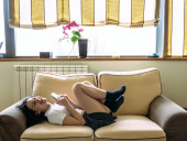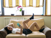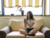 młoda kobieta rozmawia z telefonu komórkowego siedzi na schodach w domu