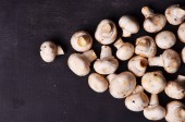 Świeże grzyby champignons na niebieskim tle, widok z góry.