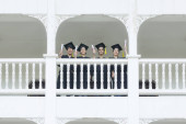 Międzyrasowi absolwenci w maskach medycznych posiadający dyplomy na schodach