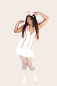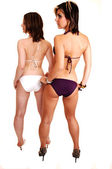 Azji i kaukaski kobieta w krótką spódniczkę i szorty z wysokim obcasie w studio i uśmiechając się w aparacie, przez białe.