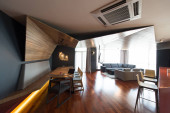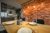 Zdjęcie "Nowoczesny duży luksusowy apartament typu studio ze stołem jadalnym" może być wykorzystywane do celów osobistych i komercyjnych zgodnie z warunkami zakupionej licencji Royalty-free. Obraz jest dostępny do pobrania w jakości wysokiej rozdzielczości do 5760x3840.
