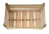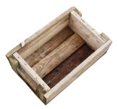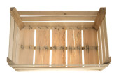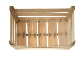 Drewniane pudełko z surowych desek. Pojemnik do przechowywania owoców i warzyw w spiżarni. Pojedyncze tło.