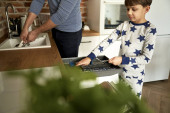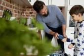Ojciec wlewa mleko do płatków śniadaniowych dla syna.