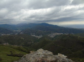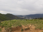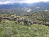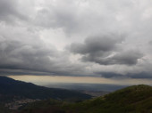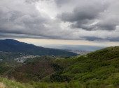 Genua, Włochy - 14 kwietnia 2021: Panoramiczny widok na góry nad miastem Genua i niewielką część portu. Szare niebo w tle.