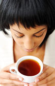 piękna kobieta z filiżankę czarnej herbaty