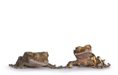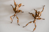 Trzy kolczaste owady liściaste znane jako Extatosoma tiaratum w pozycji obronnej. Izolacja na białym tle.