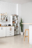 Zdjęcie "Kuchnia w stylu minimalizmu w bieli. Wysoki blat ze stołkiem barowym. Sala świetlna w stylu poddasza." może być wykorzystywane do celów osobistych i komercyjnych zgodnie z warunkami zakupionej licencji Royalty-free. Obraz jest dostępny do pobrania w jakości wysokiej rozdzielczości do 5760x3840.