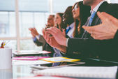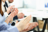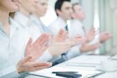 Grupa osób siedzących na szkoleniowym kursie biznesowym i klaszczących w dłonie