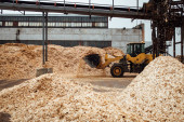 Koparka ładuje wióry drewna. duże wiadro przenośnika ładuje biopaliwa i ściółkę drewnianą. buldożer przemysłowy jest zaangażowany w rozładunek żużla