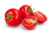 Pomidor z połową izolowany na białym tle ze ścieżką wycinania i pełną głębią ostrości.