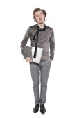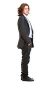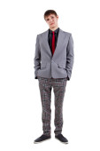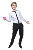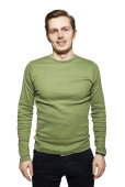 młody człowiek stoi z komputerem. Studio fotografii na tle.