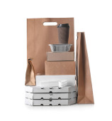Torby papierowe z naklejką TAKE OUT, pudełka na żywność i kubki na białym tle