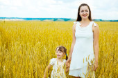 rodzina szczęśliwy; młoda matka, ojciec i córka zabawy na polu pszenicy (punkt skupienia na człowieka)