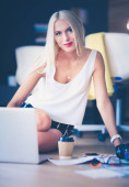 uśmiechnięta młoda kobieta siedząca z laptopem