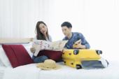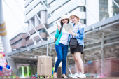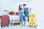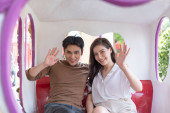 Zdjęcie "Młoda para dzwoni wideo i jedzie na wakacje do obcego kraju. Młoda para selfie szczęśliwy i udać się w podróż. Azjatki, kobiety i mężczyźni." może być wykorzystywane do celów osobistych i komercyjnych zgodnie z warunkami zakupionej licencji Royalty-free. Obraz jest dostępny do pobrania w jakości wysokiej rozdzielczości do 5760x3840.