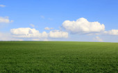 pole rolnicze z młodymi kiełkami i błękitne niebo z chmurami - piękny wiosenny krajobraz