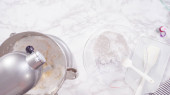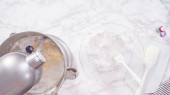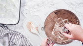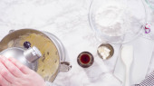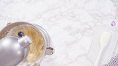 Leżeć płasko. Krok po kroku. Składniki mieszające w stojącym mikserze kuchennym do przygotowania polewy serowej.