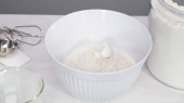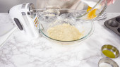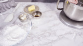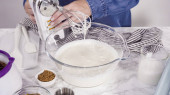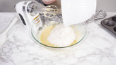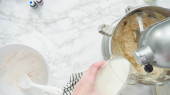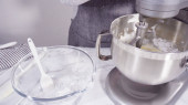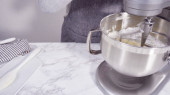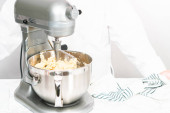 Krok po kroku. Składniki mieszające w stojącym mikserze kuchennym do przygotowania polewy serowej.