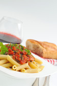Koncepcja smacznego jedzenia z makaronem z sosem pomidorowym na białym stole
