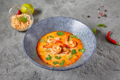 Zdjęcie "Tom Yum lub Tom Yam Soup - Hot and Sour Thai Soup gotowane z krewetek. Tajska autentyczna tradycyjna kolacja. Zupa w Blue Bowl na ciemnoszarym stole. Street azjatyckie jedzenie" może być wykorzystywane do celów osobistych i komercyjnych zgodnie z warunkami zakupionej licencji Royalty-free. Obraz jest dostępny do pobrania w jakości wysokiej rozdzielczości do 5760x3840.