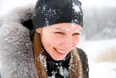 młoda kobieta w paski kapelusz i rękawiczki, uśmiechając się i trzyma kubek niebieski