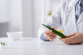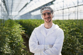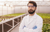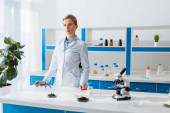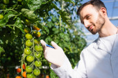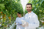 inspektor jakości w białym płaszczu patrząc przed kamerą, podczas gdy afrykański amerykański kolega pracuje na niewyraźnym tle