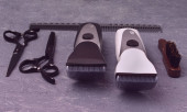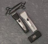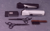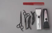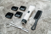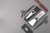 Profesjonalne narzędzia Hardressing na szarym tle marmuru. Nożyczki i nożyce do cięcia, nożyce do włosów, grzebień i szczotka Stylizowane w klasycznych czarno-białych kolorach z metalowymi ostrzami