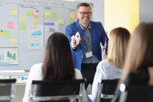Zdjęcie "Training business coach conducts seminar on successful career building" może być wykorzystywane do celów osobistych i komercyjnych zgodnie z warunkami zakupionej licencji Royalty-free. Obraz jest dostępny do pobrania w jakości wysokiej rozdzielczości do 5760x3840.