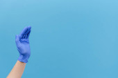 Zbliżenie męskich rąk w medycznych rękawiczkach ochronnych lateksowych pstryka palcami na muzyczny gest rytmiczny, odizolowany na tle niebieskiego studia. Skopiuj miejsce na reklamę. Z miejscem na tekst lub obraz